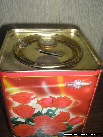Дети любят складывать денюшки (вымытые) в копилку. У нас это железная коробка из-под чая с прорезью