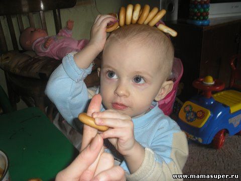 пирамидку из баранок у себя на пальце, предложите это сделать малышу.