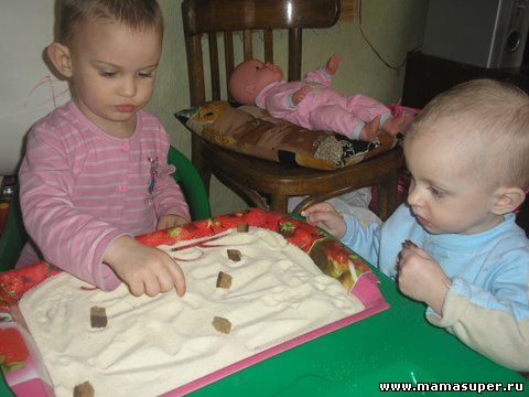 насыпать побольше, то можно отыскивать спрятанные кубики, резиновые игрушки или